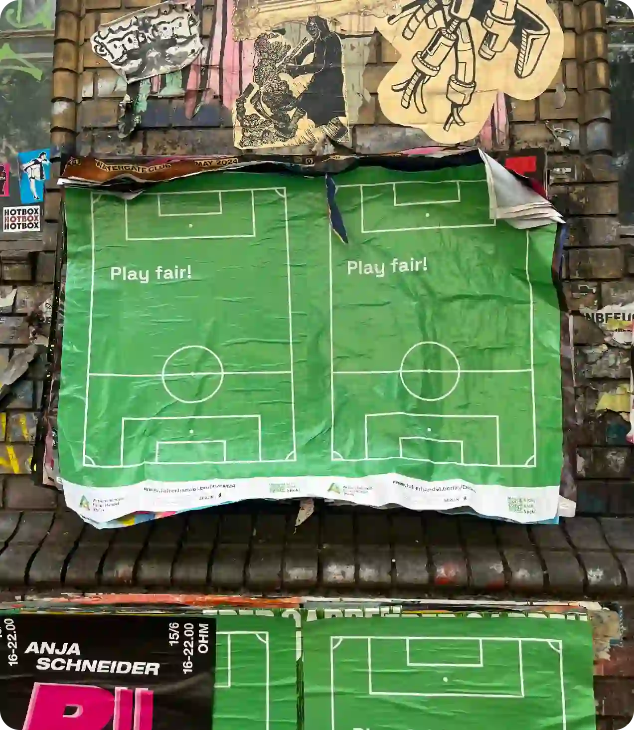 For the EM 2024, we created a comprehensive campaign for Fair Trade Berlin, merging fair trade values with football culture. The campaign includes poster design, social media assets, illustrations, city video walls, and merchandise. Using a bold, minimal visual approach with clear messaging, the campaign draws attention to ethical consumption and fair production, while visually connecting the energy of the tournament with the values of responsibility and sustainability across all platforms.